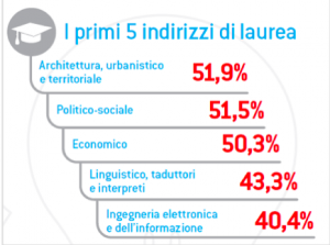 Da notare, ma non sorprende, il primato delle nuove assunzioni di laureati in architettura, urbanistica e territorio: al 51% di loro sarà richiesta una conoscenza del mondo 2.0, fatto che si lega certamente all’emergere delle nuova frontiera della “smart city” (come riportato anche in questo articolo di CorCom).. La città intelligente del futuro coinvolge in prima linea architetti e ingegneri, chiamati alla progettazione di spazi urbani basati su tecnologie che rendano la vita più confortevole, sana, sostenibile. Un settore in grande espansione, nel quale anche l’Europa sta sostenendo molto, e rispetto al quale anche le Università dovrebbero cominciare ad attrezzarsi meglio con corsi, indirizzi, master ad hoc. (in Italia ci sono stati delle prime iniziative, per esempio, nelle Università di Firenze, Trento, Roma – Tor Vergata e Perugia. Un tema che riprenderemo a breve).