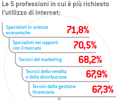 Tra le professioni dove c’è più richiesta di digitale spiccano gli specialisti in scienze economiche e nei rapporti con il mercato e i tecnici di vendita, distribuzione, marketing e gestione finanziaria.