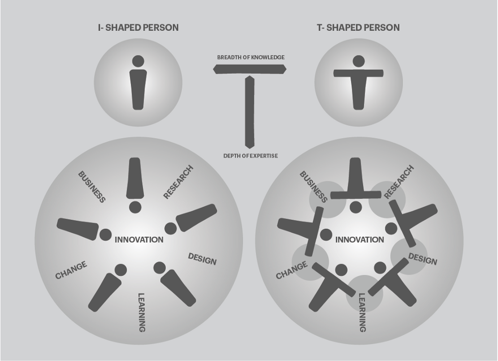 Una bella definizione di innovation designer, fornita dallo studio canadese di innovation designThe Moment , è questa: un Innovation Designer è il professionista dotato di competenze diversificate che gli consenteno di supportare le organizzazioni nella transizione da dove sono ora a dove dovranno essere domani. Fondamentale è la formazione cosiddetta T-Shape: cioè, la competenza approfondita in un settore specifico, ma accompagnata da una più ampia serie di ulteriori conoscenze che rendono quella persona elastica e capace di pensiero laterale.