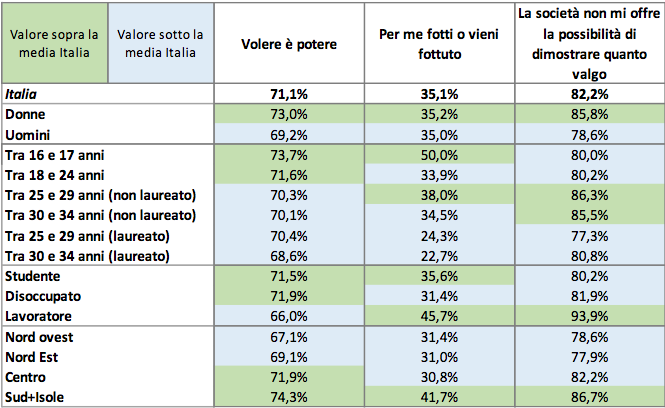 In generale, la ricerca mostra anche come sia diffusa la convinzione di non poter controllare il proprio destino, perchè la società non offre davvero la possibilità di dimostrare il proprio valore.