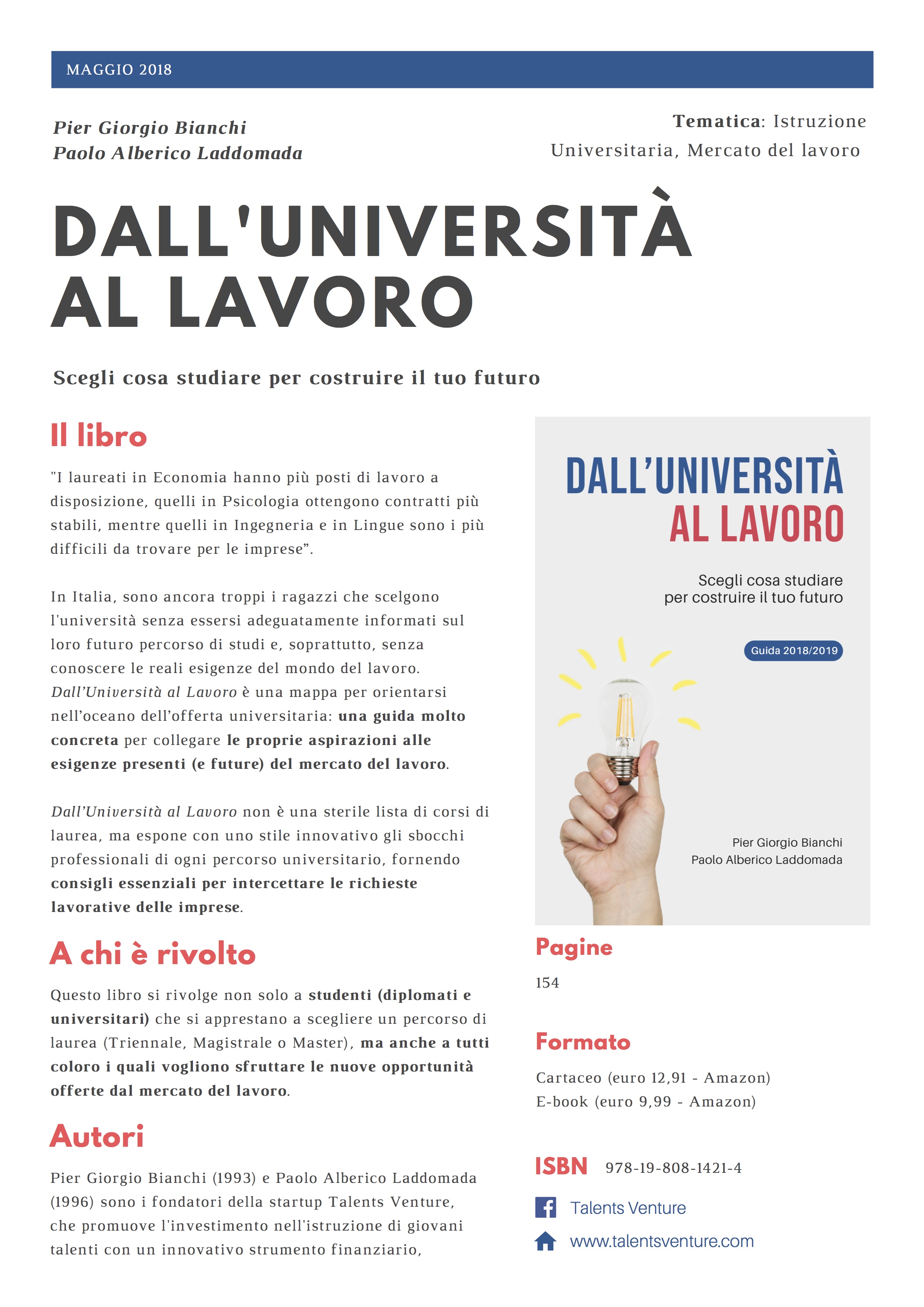 Si intitola ‘Dall’Università al Lavoro: Scegli cosa studiare per costruire il tuo futuro. Guida all’Università 2018/2019‘ e l’anno scritto due giovani ex-studenti, Pier Giorgio Bianchi e Paolo Alberico Laddomada. E’ una guida all’università che, partendo dalle esigenze presenti e future del mercato del lavoro italiano, fornisce ai ragazzi una pratica mappa per orientarsi in modo sintetico ed intuitivo nell’oceano dell’offerta universitaria.