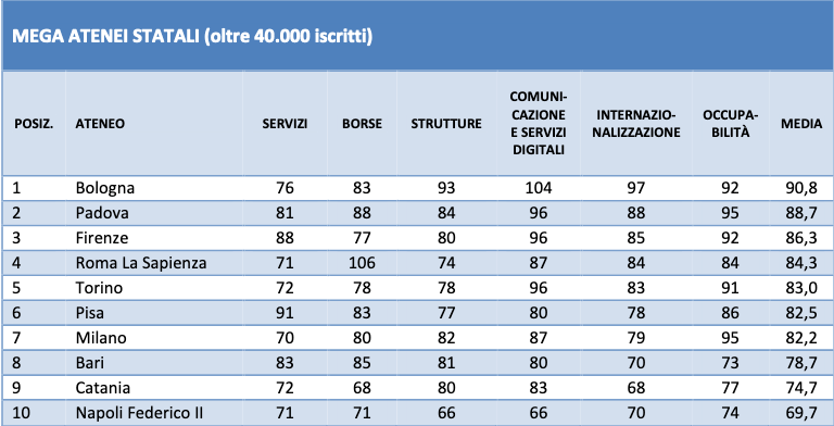 La classifica delle università del Censis 2019/2020 valuta gli atenei, divisi in categorie omogenee per dimensione e status (pubbliche private), relativamente alle strutture disponibili, ai servizi erogati agli studenti, al livello di internazionalizzazione e alla capacità di comunicazione digitale.